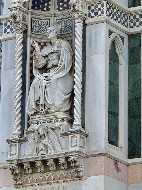 Here's the façade. In common with many churches in Tuscany, not just in this city, this bi-coloured or even tri-coloured marble mosaic gives a striking appearance to the front entrance. The remainder of the church, including its bell tower, sticks to the native orange/brown sandstone.